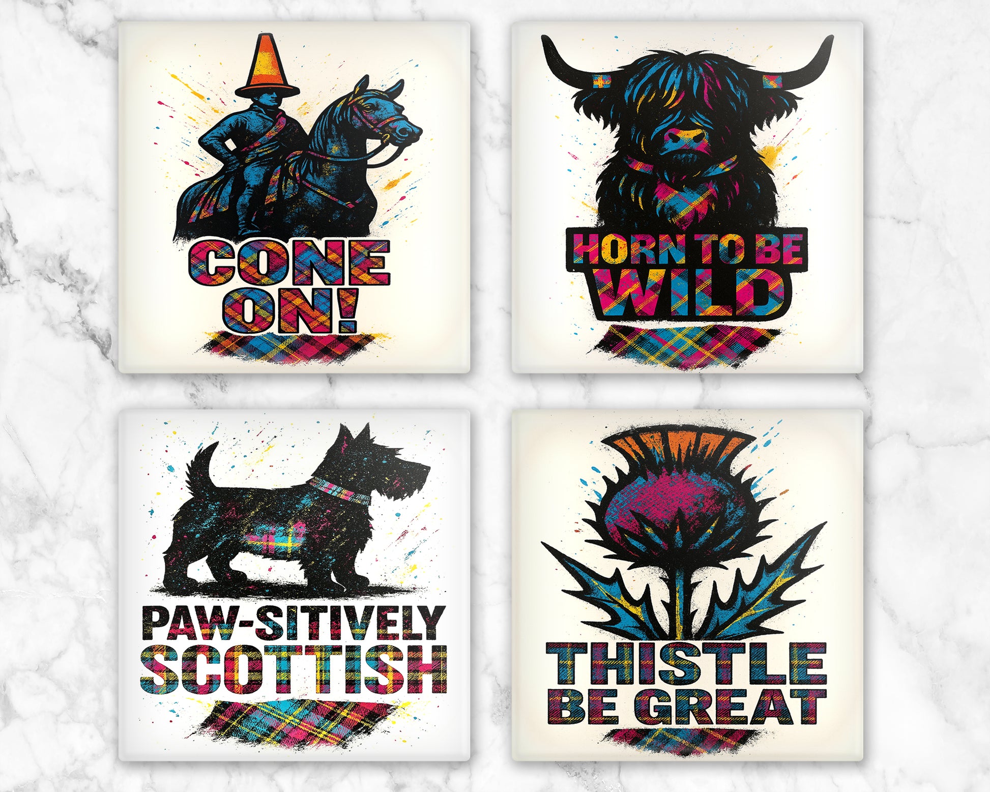 Each coaster features bold, colourful artwork celebrating iconic Scottish culture – from Highland cows and Scottie dogs to thistles, Clydesdale horses, and classic sayings with a playful twist. Perfect for brightening up your kitchen, living room, or as a unique Scottish gift