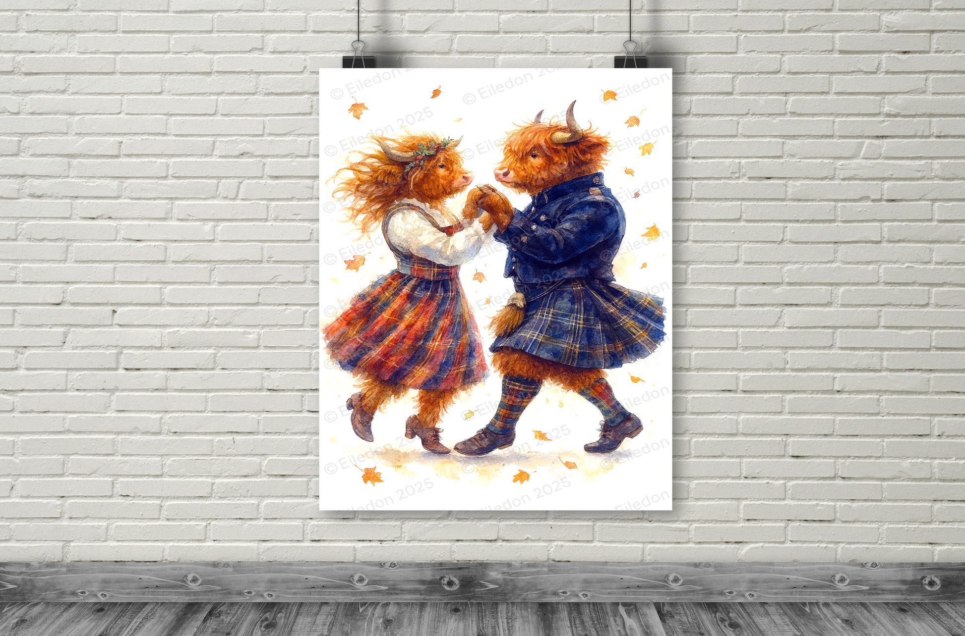 Capture the joy of tradition and romance with this enchanting watercolour art print of two Highland Cows dancing a ceilidh. Dressed in classic tartan kilts and highland attire, the pair twirl gracefully among autumn leaves, celebrating Scottish culture with warmth and charm.