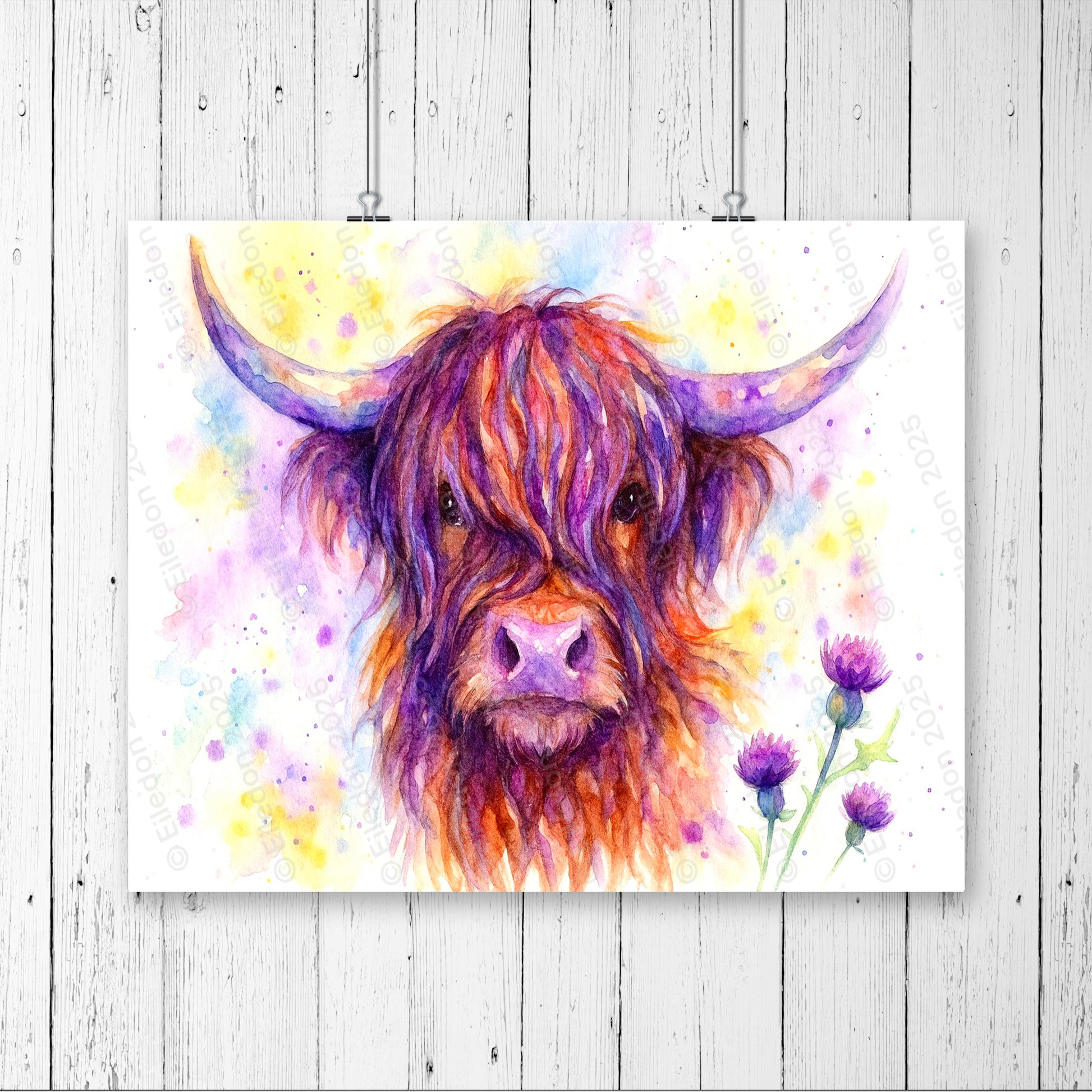 Highland Cow & Thistles Watercolor Wall Art Print – Vibrant Scottish Farmhouse Décor